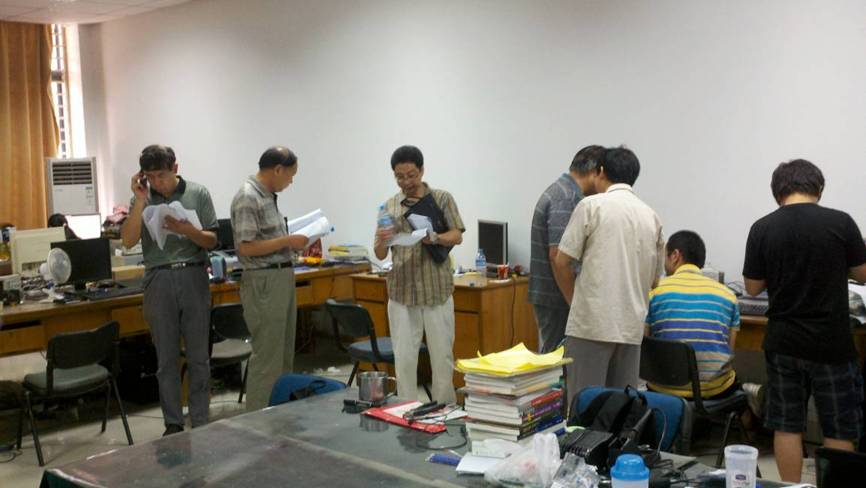 在检查中,陈鹤鸣处长一行首先详细了解了各参赛队伍的训练计划执行情况、教练指导情况,参赛队员的生活情况等,嘱咐参赛队员暑期天气炎热,要注意防暑降温,劳逸结合;对于部分参赛队伍在训练房间自行设计和焊接芯片,他强调一定要注意用电、腐蚀等安全工作;最后他鼓励参赛队员在假期集训期间要刻苦努力,认真钻研,积极准备,争取在8月初的江苏省电子设计竞赛中获得好成绩。