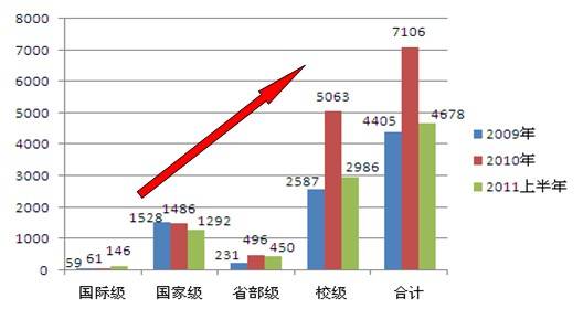 图3 本科生各级科技竞赛参赛情况(2011年为一学期)