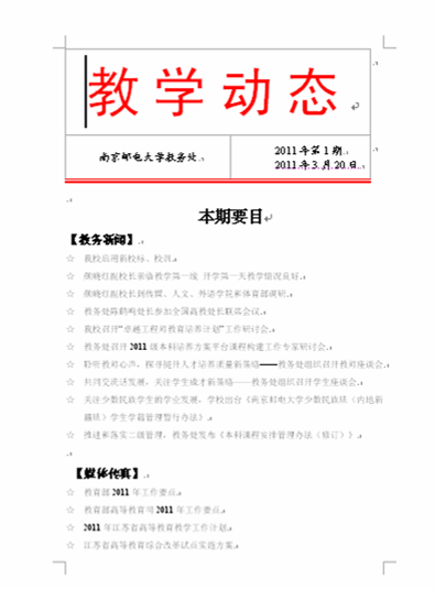 在学校启用新校标、校训之时,《教学动态》创刊。《教学动态》凝结了我校教学管理部门的集体智慧,是对外宣传我校教学及教学管理的窗口,每月一期,包括了教务新闻、学院风采、媒体传真三个栏目,充分反映我校教学及教学管理各级部门的最新动向,提供教学管理和改革的新动态。《教学动态》架起教师、各级教学主管单位和学校其他部门之间沟通的桥梁,记录我校教学及教学管理工作的历程,见证教师以及教学管理人员的辛苦和执着。目前《教学动态》已经发行了四期,以其朴实、新鲜的风格,在校园中畅行。