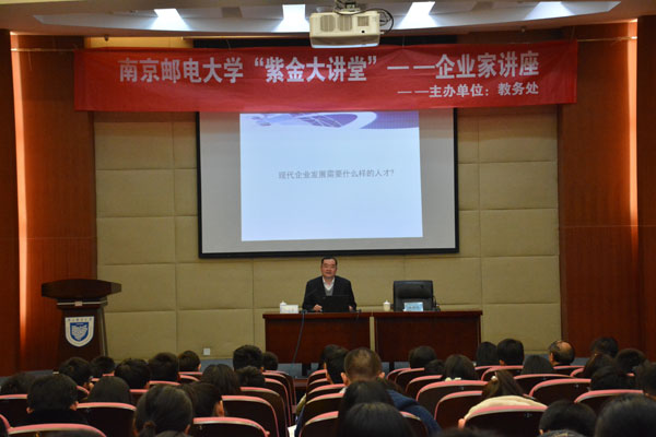 12月2日下午,由教务处主办、贝尔英才学院承办的南京邮电大学“紫金大讲堂”――企业家讲座第51次活动在仙林校区行政楼一楼报告厅举行。南京吉隆光纤通信股份有限公司常务副总经理金立勇先生应邀莅临“紫金大讲堂”,作题为“现代企业发展需要什么样的人才”的讲座。讲座由贝尔英才学院院长陈鹤鸣教授主持。