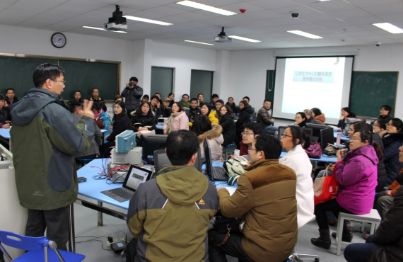 电子科学与工程学院王自强副教授作了主题为《以学生为中心的翻转课堂教学模式初探》专题报告。王教授从慕课课程的建设、翻转课堂的整体架构等方面,详细阐述了课程开设前硬件设施的建设与改造、以学生为中心的教学模式与理念,分享了在课程建设与开设过程中的经验和体会,并展示了学生们在翻转课堂上饱满的学习状态和理想的学习效果。王教授的报告引起了与会教师的共鸣,教师们在与王教授的互动与交流中,在翻转课堂教室的实际体验中,体会到了以学生为中心的教学模式对教学的重要意义。报告会后,与会教师参观了南京大学电子电工实验教学中心,并与庄建军副主任进行了交流。