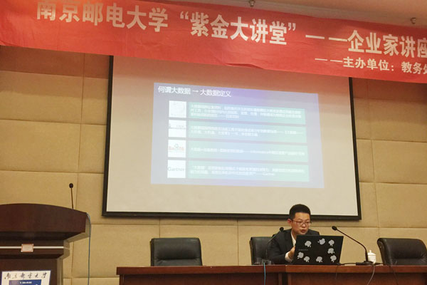 4月27日晚,由教务处主办、计算机学院、软件学院承办的南京邮电大学“紫金大讲堂”――企业家讲座第55次活动在仙林校区行政楼一楼报告厅举行。中科曙光江苏分公司高级工程师左洪年先生莅临“紫金大讲堂”,作题为“大数据时代下的小数据生活”的讲座。讲座由计算机学院、软件学院胡素君老师主持。