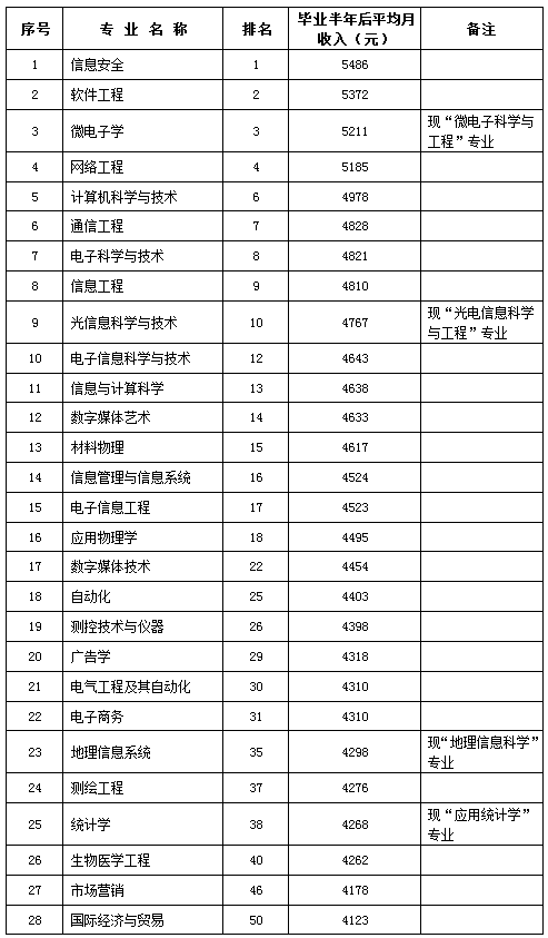 南京邮电大学进入2015届大学生毕业半年后收入top50专业