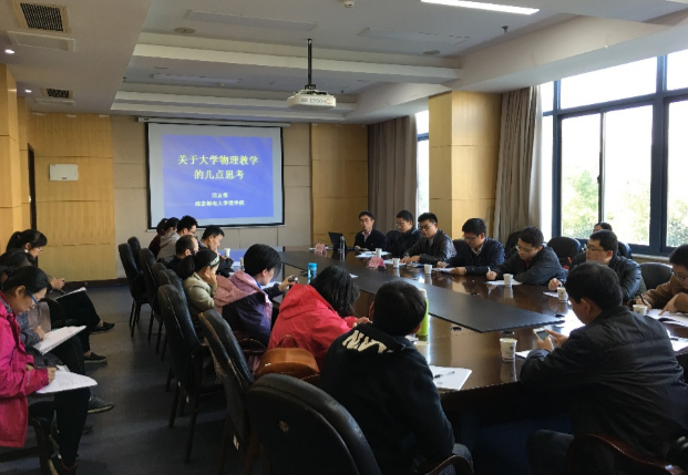校教学名师、理学院田友伟副教授首先作了题为“关于大学物理教学的几点思考”的报告。他从备课前准备、精心备课、认真上课、课后反思、作业批改、考试总结、授课的几点建议等七个方面,阐述了做好课堂教学的重点。