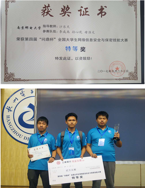 9月23日,第四届“问鼎杯”全国大学生网络信息安全与保密技能大赛在杭州圆满落幕。经过8小时的激烈角逐,由我校计算机学院、软件学院、网络空间安全学院教师沙乐天所指导的孙心乾、李成禹、母浩文等三位同学组成的X1cT34m战队荣获本届比赛惟一的一项特等奖。该项成绩充分体现了我校学子在信息安全实战攻防领域的动手能力及创新水平!