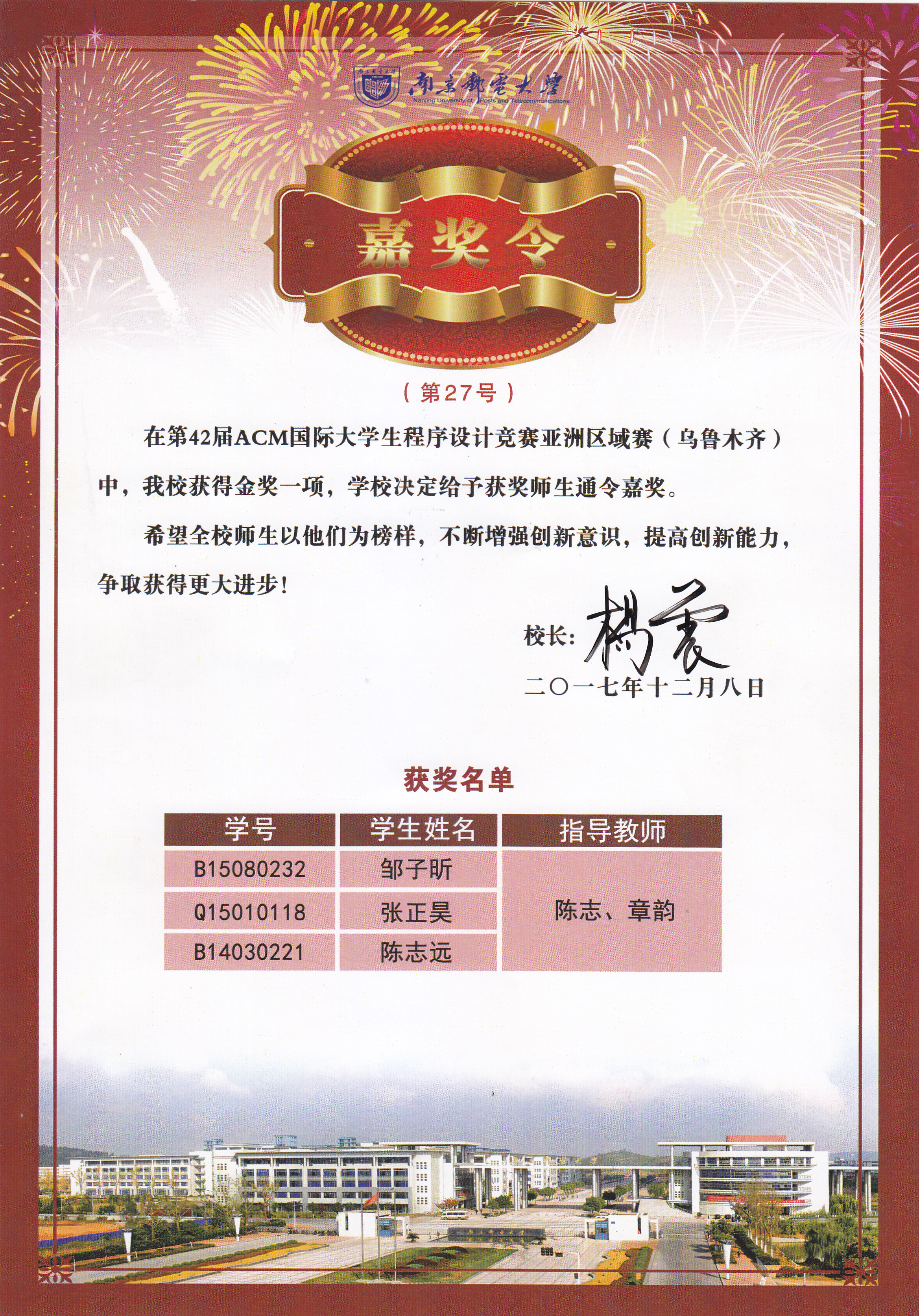 杨震校长签发嘉奖令表彰我校“第42届ACM国际大学生程序设计竞赛亚洲区域赛“获奖师生