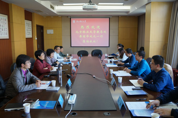 4月10日下午,北京林业大学教务处黄国华处长、冯强副处长率教务处、马克思主义学院一行6人来我校,就两校本科教学总体情况、相关管理特色与经验等方面进行调研与交流。教务处张玲华处长接待了来宾,双方在仙林校区第二会议室进行座谈。我校教务处、马克思主义学院相关负责人及老师参加了此次交流会。