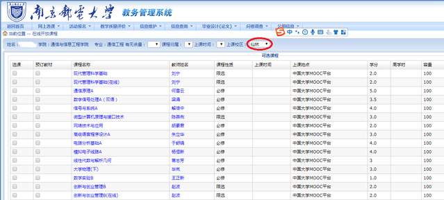 网址:http://jwxt.njupt.edu.cn/,亦可通过学校主页(www.njupt.edu.cn)—教务处主页—综合信息服务—教务管理系统,登录选课系统。
