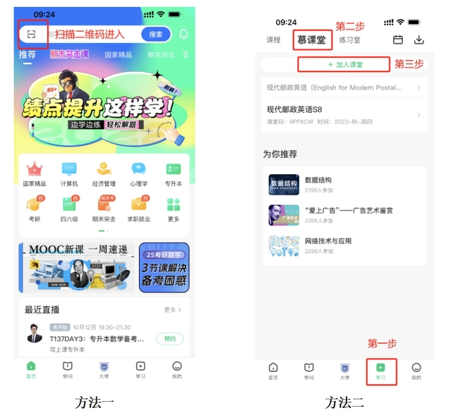 方法二:点击底部栏目“学习”,点击“慕课堂”,点击“加入课堂”,可以通过“扫码加入”或者“输入课堂码加入”,加入相应课程的慕课堂。