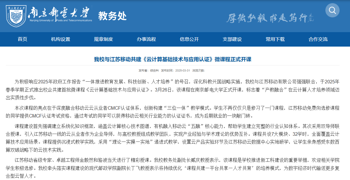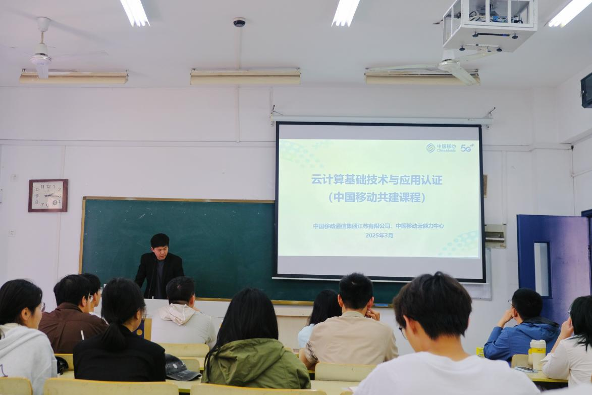 为加快数智人才培育、服务数字中国战略,2025年春季学期,江苏移动与南京邮电大学联合开设《云计算基础技术与应用认证》课程。课程聚焦云计算领域的核心技术与应用发展,深度融合江苏移动在网络云运维、智算中心管理、低碳节能等方面的实践经验,构建起“理论+实践+认证”三位一体教学模式,打造“课程共建+案例共享+认证协同”的产教融合人才培养新范式。