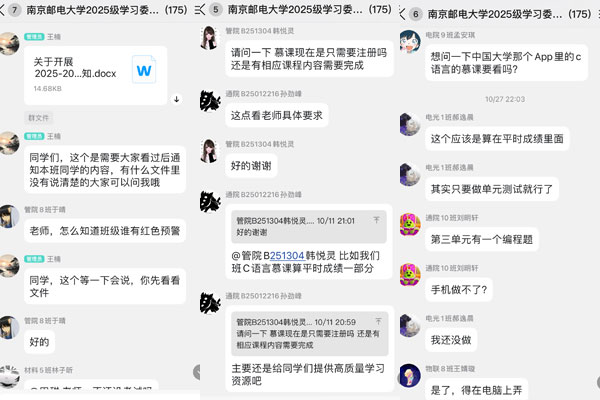 另一方面,该群更是一个充满活力的“新生学业互助社区”。面对全新的学习环境与管理系统,2025级学习委员们在群内积极交流、互帮互助,共同探讨解决智慧学工系统操作、晚自习考勤落实、在线课程(MOOC)学习要求、选课规则理解等高频实际问题。这种即时、高效的朋辈答疑与经验分享,不仅有效解决了新生的具体困惑,也迅速提升了新生学习委员的业务能力和服务意识,增强了团队凝聚力。学业指导中心老师则在群内提供必要的引导与权威支持,确保信息准确、解答专业。