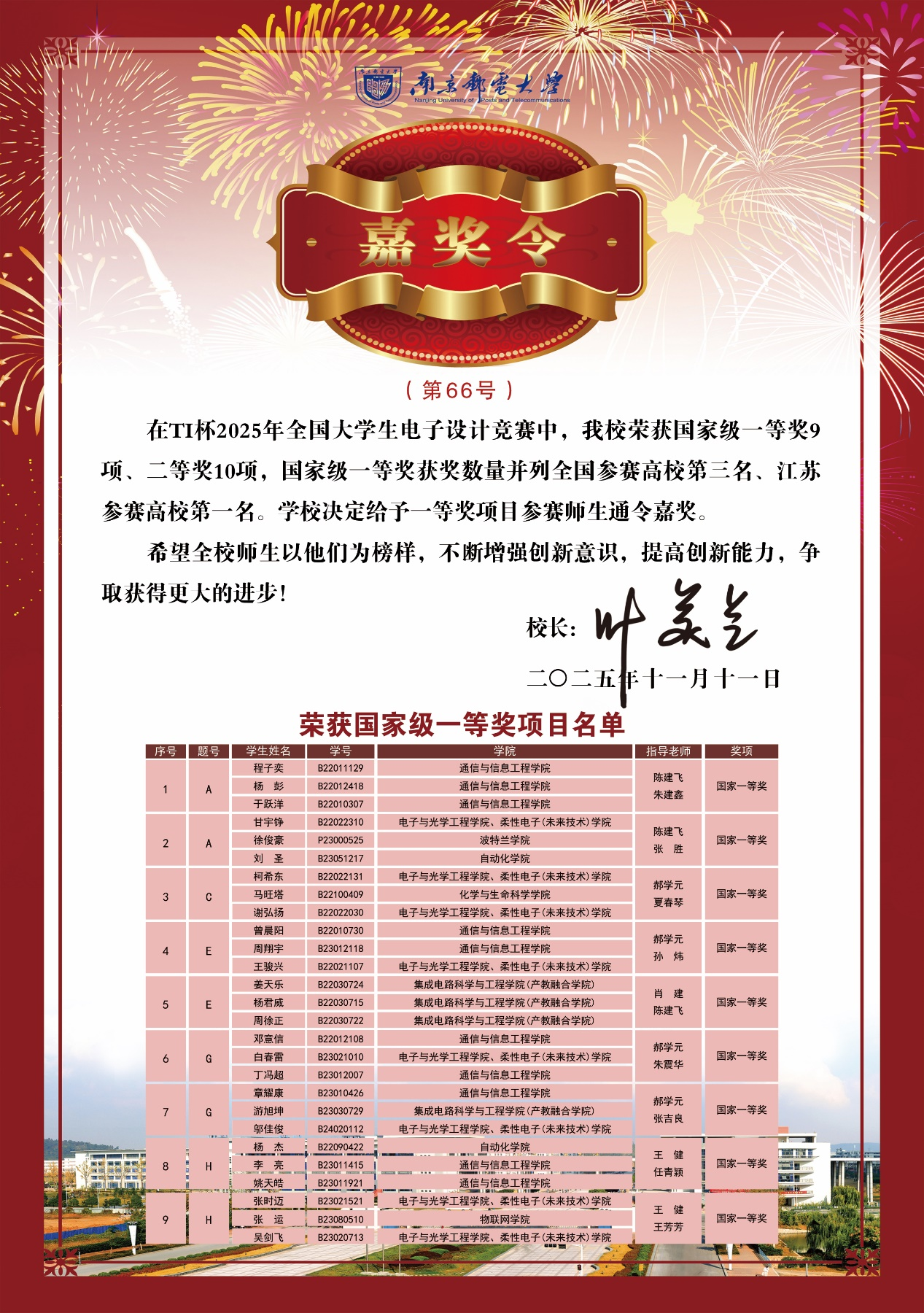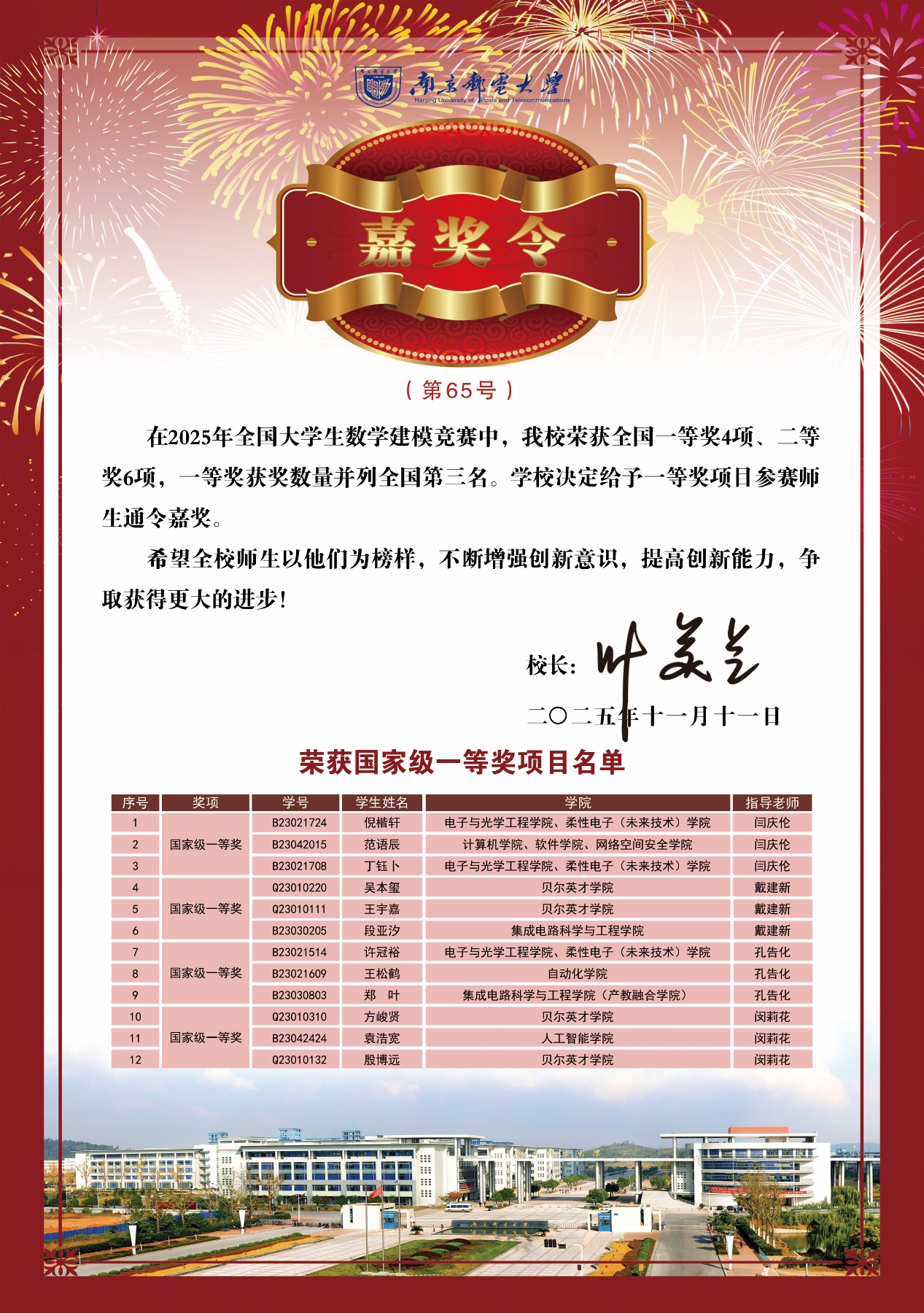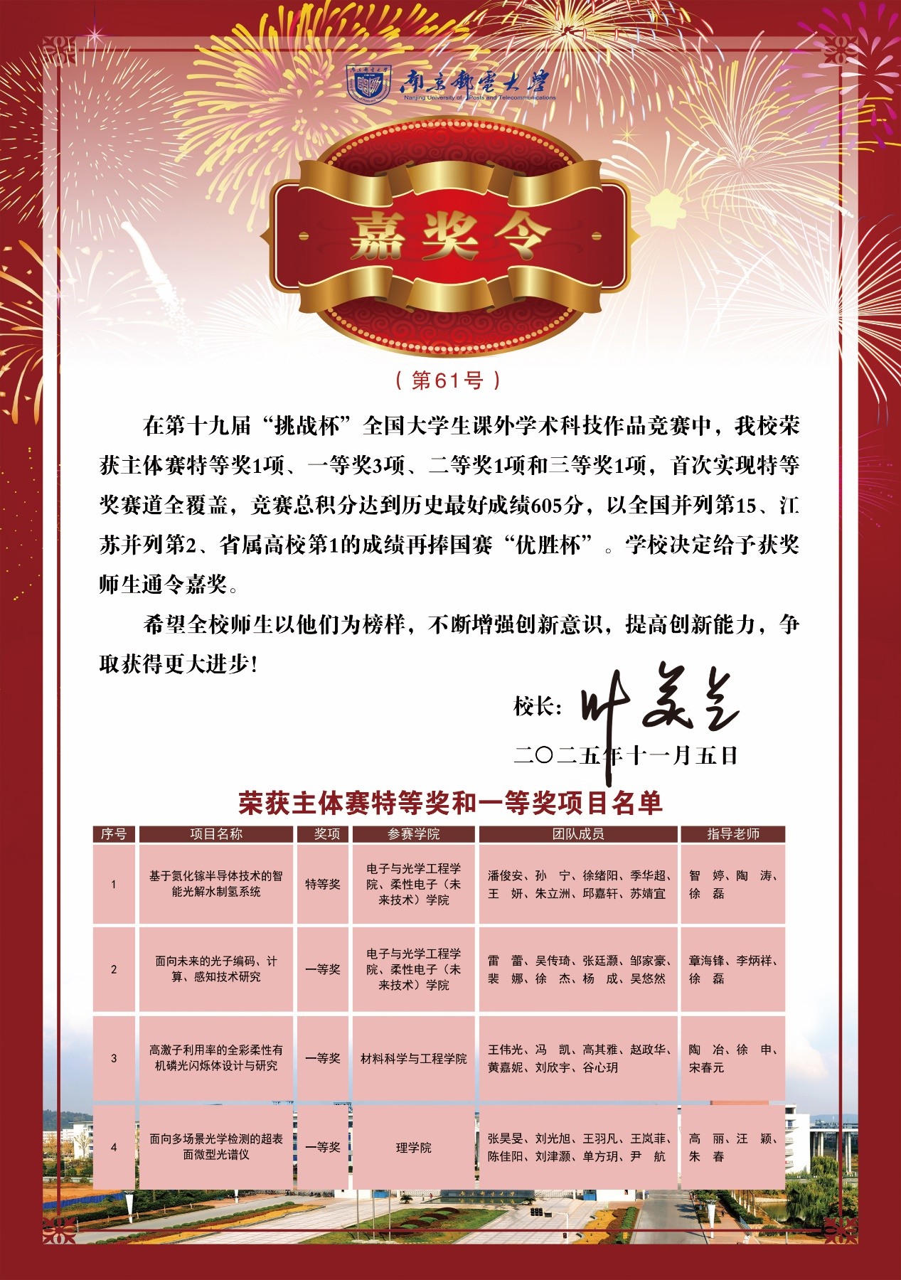 近日,南邮学子在中国国际大学生创新大赛、第十九届“挑战杯”全国大学生课外学术科技作品竞赛、全国大学生数学建模竞赛、全国大学生电子设计竞赛和全国大学生职业生涯规划大赛中勇夺佳绩。叶美兰校长向获奖师生表示热烈祝贺,并为获得国家一等奖的师生颁发校长嘉奖令,希望全校师生以他们为榜样,不断增强创新意识,提高创新能力,争取取得更大进步。