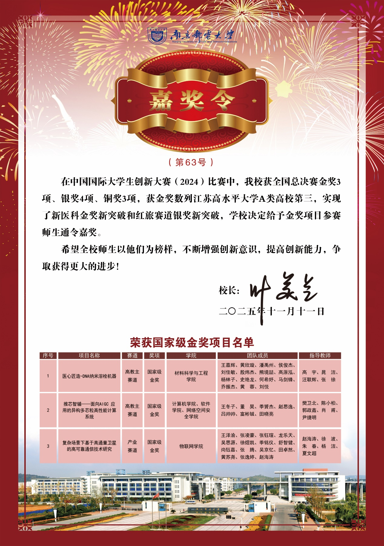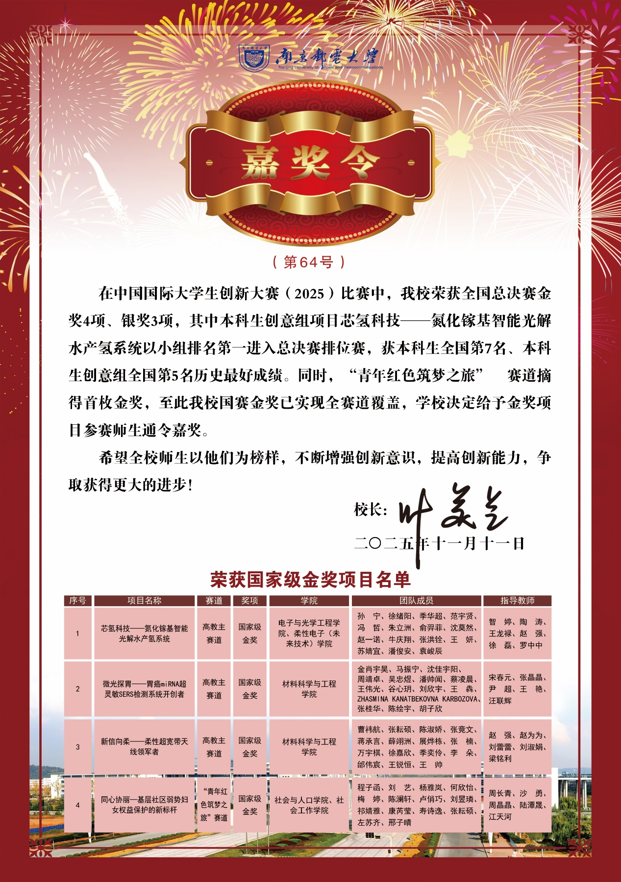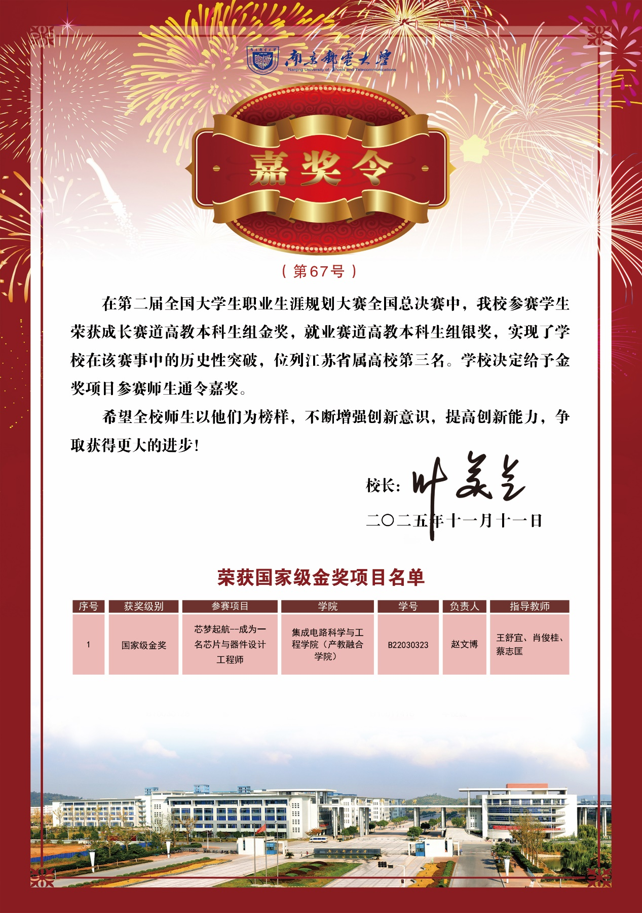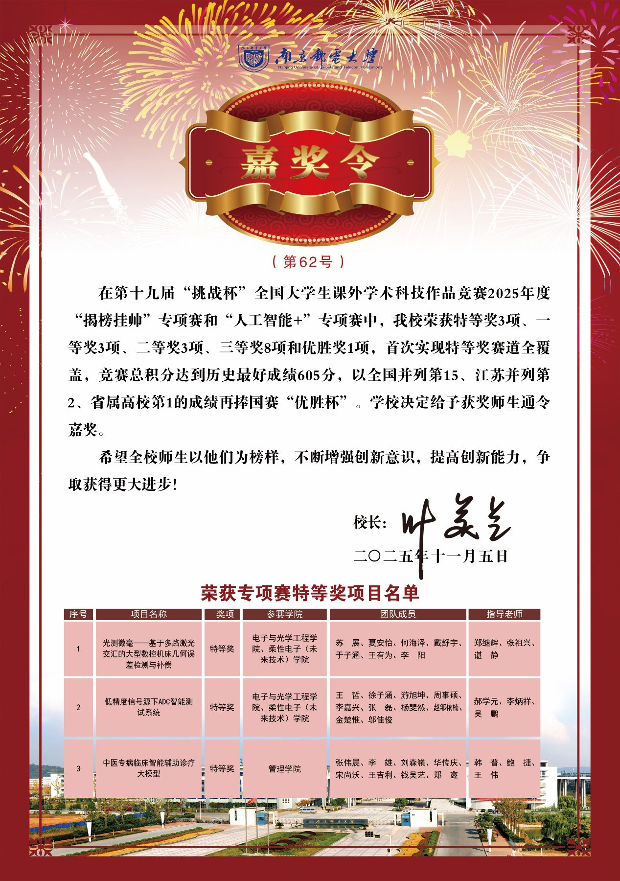 近日,南邮学子在中国国际大学生创新大赛、第十九届“挑战杯”全国大学生课外学术科技作品竞赛、全国大学生数学建模竞赛、全国大学生电子设计竞赛和全国大学生职业生涯规划大赛中勇夺佳绩。叶美兰校长向获奖师生表示热烈祝贺,并为获得国家一等奖的师生颁发校长嘉奖令,希望全校师生以他们为榜样,不断增强创新意识,提高创新能力,争取取得更大进步。