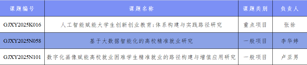 近日,高校毕业生就业协会公布了“2025年度高等学校毕业生就业创业研究课题”立项结果,我校共获批3项课题,其中包括重点项目1项、一般项目2项。此次立项集中体现了我校教师在人工智能赋能毕业生创新创业教育与精准就业服务这一前沿交叉领域的扎实研究基础与持续创新能力。