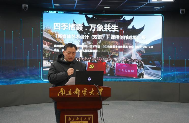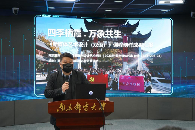 本次《新媒体艺术设计(双语)》课程成果汇报在本科生院的悉心指导与支持下圆满完成。活动不仅是一次常规教学成果展示,更是一次以数智技术赋能在地文化、以设计创新回应现实场景的教学实践。课程通过设置真实创作命题、搭建多方协作平台,引导学生在跨学科、跨场景的学习环境中深化专业认知,为数字媒体艺术设计专业探索出具有现实意义的教学创新路径,也为栖霞山文化的数字传播与美学表达注入青春活力。