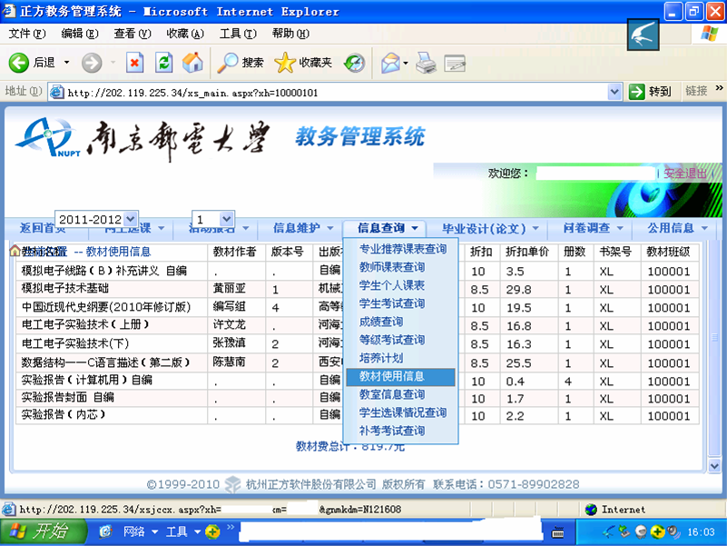 通过学校主页(www.njupt.edu.cn)—快速通道—教务导航—网上选课,登录选课系统中信息查询→教材使用信息查询教材情况;教材使用情况登陆界面如下: