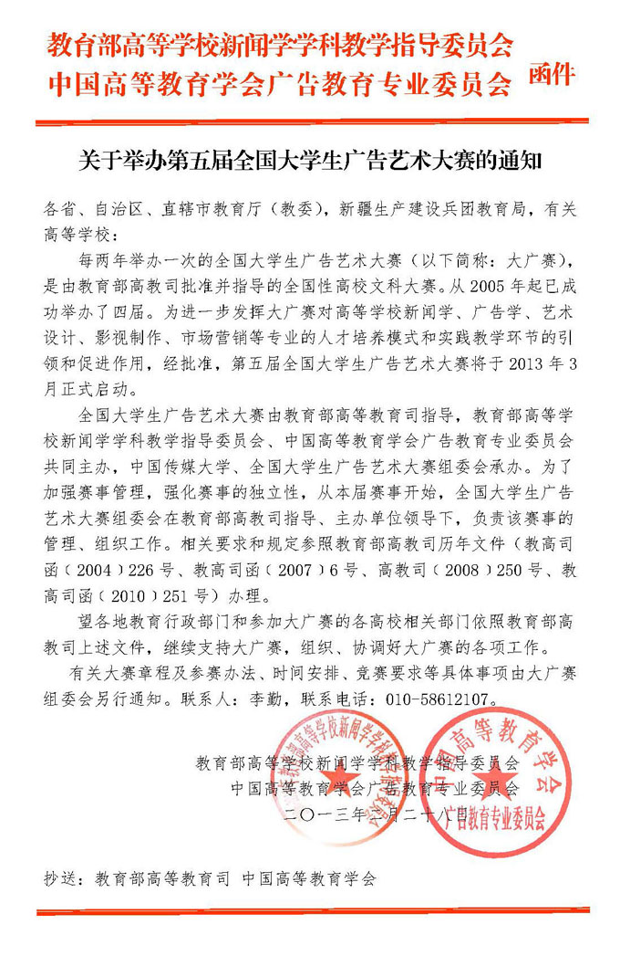为了提高大学生的创新精神和实践能力,激发大学生的创意灵感,促进大学新闻传播、广告、艺术教育的人才培养模式的改革,同时选拔优秀作品参加2013年第五届全国大学生广告艺术大赛,经学校研究决定,将于2013年6月举办2013年南京邮电大学广告艺术大赛。本次竞赛由教务处主办,传媒与艺术学院承办。现将有关事项通知如下: