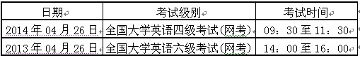 请参加四六级考试(网考)的考生于2014年04月26日上午8:30(四级)/下午13:00(六级)准时在指定地点集中候考(具体安排见附件1),由监考老师指定考试机位号后才能进入考场。