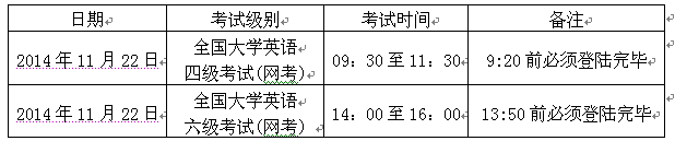 请参加四六级考试(网考)的考生于2014年11月22日上午8:30(四级)/下午13:00(六级)准时在指定地点集中候考(具体安排见附件1),由监考老师指定考试机位号后才能进入考场。