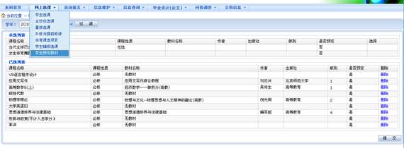 系统默认所有必修课程是选用教材的,课程信息和教材信息都在“已选列表”中,如果不需要教材可以选择“删除”,该门课程的教材信息就会变动到“未选列表”中,完成选用程序后,点击“提交”。