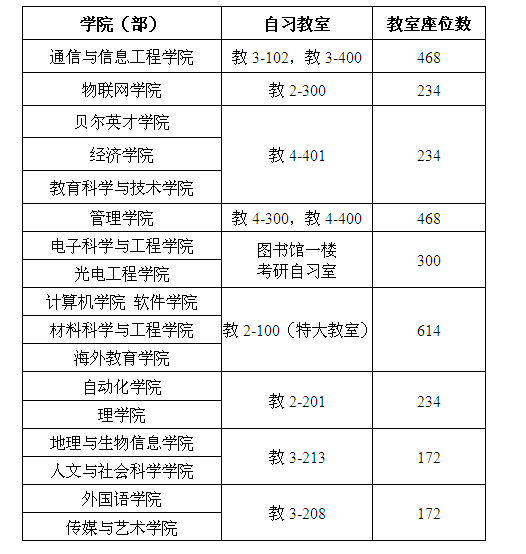 在确保教学活动正常进行的前提下,为方便考研学生上自习,学校已在仙林校区开放了部分教室供考研学生(2013级学生)自习优先使用(有教学活动、考试安排等活动时学生须让出),并在仙林校区教学楼、图书馆为考研学生配备了存放学习资料的柜子,教室信息见下表。