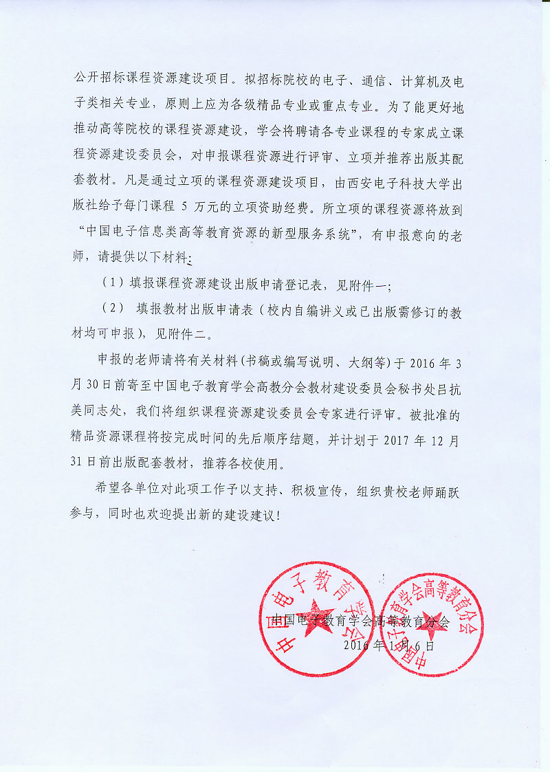 为适应信息技术的发展,开展教材资源建设,积极配合中国电子教育学会高等教育分会“高等院校电子信息类课程资源建设”的工作,请各学院通知教师按照文件(附件1)要求积极申报。