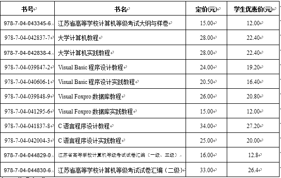 4.学校提供《江苏省高等学校计算机等级考试配套教材》的征订,秉承自愿原则,为学生提供便捷服务,所有教材按照优惠价收费, 缴费仍采用从学校给学生发放的中信卡中直接扣款的方式。