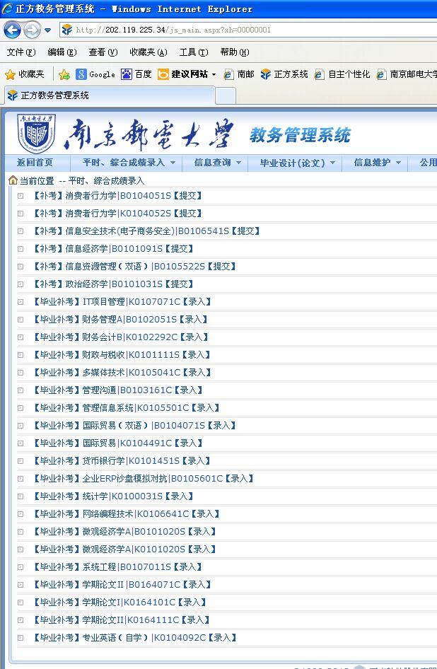 2、成绩录入系统已开放,请成绩录入教师用教学秘书的用户名和密码登陆系统,录入清欠考试(终极补考)(正方教务系统中标注为:毕业补考,如下图所示)课程成绩。