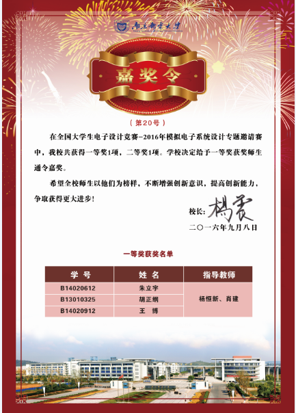 杨震校长签发嘉奖令表彰我校“全国大学生电子设计竞赛-2016年模拟电子系统设计专题邀请赛”获奖师生