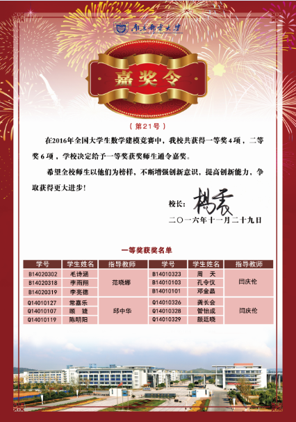 杨震校长签发嘉奖令表彰我校“全国大学生数学建模竞赛”获奖师生