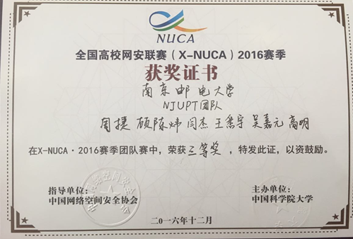 12月21日,我校计算机学院、软件学院学生周捷、王悉宇、闫杰、吴嘉元、顾陈炜等在由中国网络空间安全协会及教育部高等学校信息安全专业教学指导委员会指导,中国科学院大学主办的全国高校网安联赛(X-NUCA 2016)决赛中荣获三等奖。X-NUCA是面向全国高校学生的网络安全技能竞赛,大赛秉承“寓学于赛,以赛促学”的理念,推出“竞赛+”模式,将赛前指导、赛中锻炼和赛后交流三者有机结合,旨在更好地促进国家网络空间安全人才的培养和选拔。